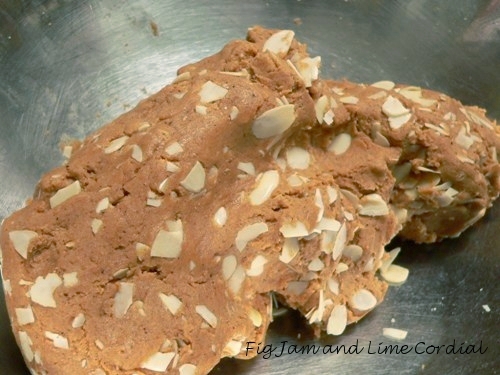 2. Add the eggs and vanilla and work the mixture together to form a dough (I use my hands to do this). Add the flaked almonds and very gently work them into the dough. It’s impossible to do this without crushing some of the almond flakes, but try to keep as many intact as possible, while still ensuring that they’re worked evenly through the dough.
