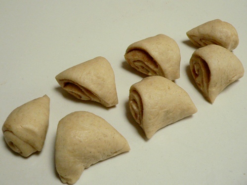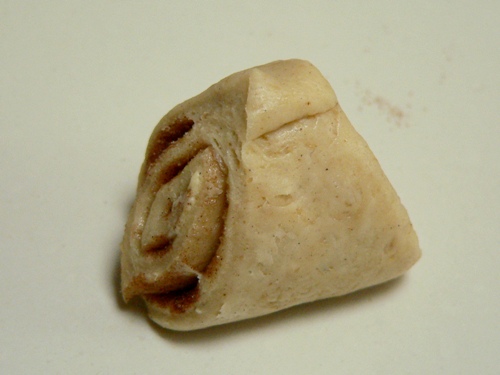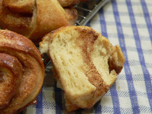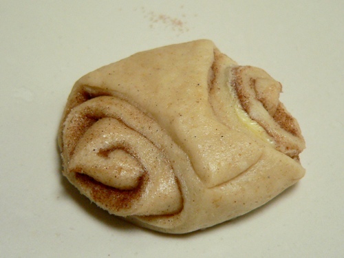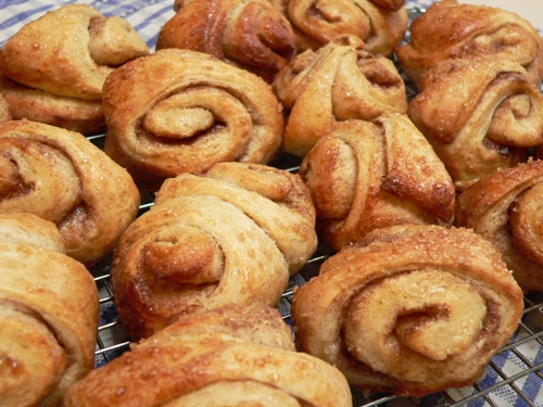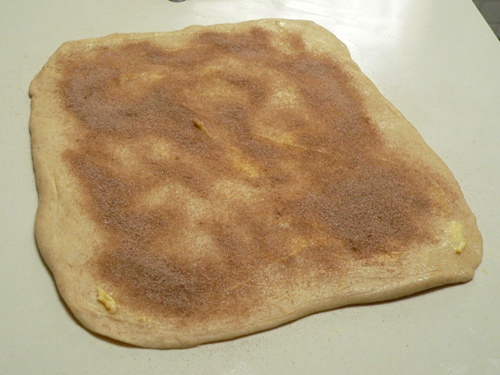 Work each piece of dough into a rectangle, then smear it with butter and sprinkle over the combined cinnamon and sugar (the cardamom is mixed into the dough itself). Roll it up tightly longways, so that you get a long thin roll, rather than a short, fat one.