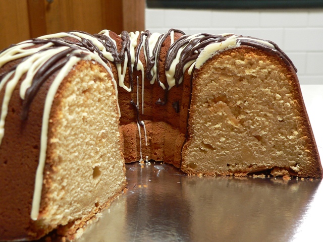This white chocolate bundt cake is a tried and tested Mrs Fields recipe from her Great American Desserts cookbook. It is Big Boy’s all time favourite treat. The white chocolate you use will determine whether your cake is good or great – we use Callebaut, but I’ve successfully used white Lindt in the past. I’ve substituted Greek yoghurt for the original sour cream with no ill effect – if anything, it’s a little lighter and easier to eat with the reduced fat content. I finish the cake by either dusting it with icing sugar, or drizzling white and milk chocolate over the top, depending on how energetic I’m feeling.