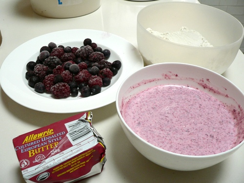 This particular cake came about quite serendipitously – our miller friend Kevin Sherrie spotted us a half bag of self-raising flour (half a 25kg bag, that is), I had berries from our last trip to Marrickville, and Pete had a fresh batch of yoghurt made, which I flavoured with a little berry puree.