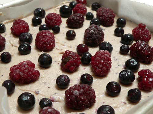 3. Stir in half the flour and half the yoghurt until just combined. Then stir in the remaining yoghurt and flour until combined. Scrape the batter into the prepared tin and smooth the top. Scatter the berries evenly over the top and bake for 35 – 40 minutes (check it after 30 minutes), or until a skewer inserted into the centre comes out clean.