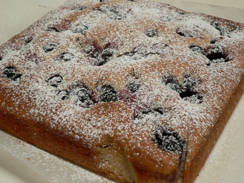 The original recipe specified fresh blueberries, but I never have them on hand, so I always use defrosted frozen berries. Note that you really do need to let them defrost, or they’ll sink like stones into the cake batter. As it was, mine were still a little too cold, hence the craters in the top of the cake.