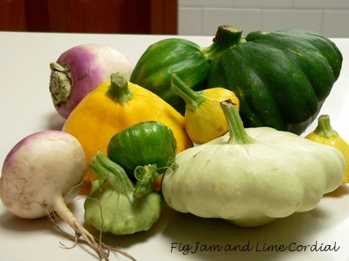 She brought with her a bag full of large squashes from her farm garden, with a couple of turnips thrown in for good measure. Aren’t they magnificent? I was a little tempted to keep them as a table decoration.
